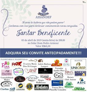 Dia 10 de abril a Associação Santanense do Deficiente Físico, conhecida como Assandef comemora 30 anos desde a sua fundação e para comemorar a data do início do trabalho em prol as pessoas com deficiência, a Assandef organizou um jantar comemorativo no Solar Dom Pedro da noite de sexta-feira, dia 05 de abril. Os ingressos podem ser comprados antecipadamente através dos pontos de venda, lojas que são padrinhos e madrinhas: