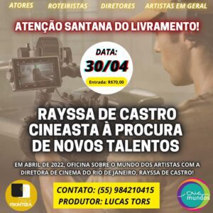 Cineasta Rayssa de Castro realizará oficina de cinema em busca de novos talentos Cineasta, diretora de teatro, atriz, humorista, roteirista, produtora e reparadora de elenco estará em Sant’Ana do Livramento em evento aberto para o público em geral Organizada pelo ator Lucas Tors, a oficina propõe trazer para a fronteira a voz experiente no ramo artístico da diretora e cineasta Rayssa de Castro, que estará em busca de novos talentos na fronteira e acontecerá no mês de abril.
