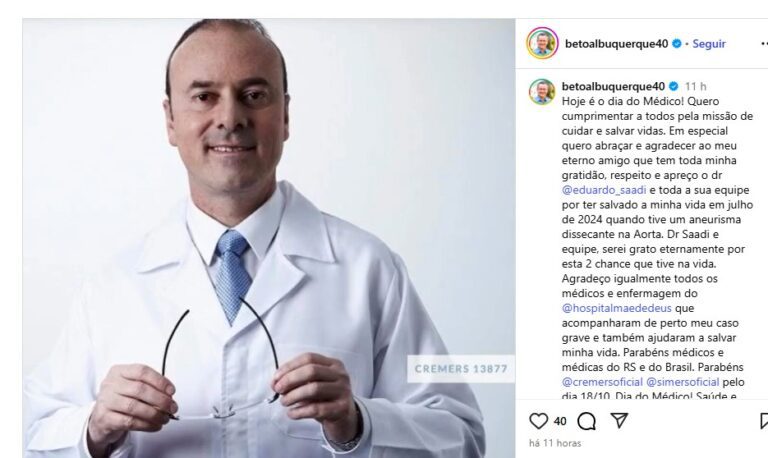 O Dia do Médico, celebrado em 18 de outubro, ganhou um tom pessoal e emocionado nas redes sociais do ex-deputado federal e vice-presidente nacional do PSB, Beto Albuquerque. Em uma postagem, ele não apenas parabenizou toda a classe médica pela data, mas também relembrou o momento crítico de saúde em que a dedicação dos profissionais foi essencial para salvar sua