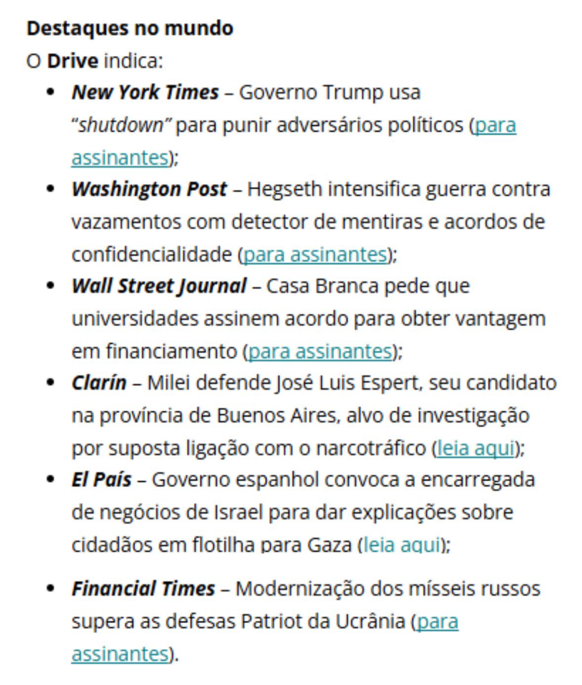Brasil aplaude plano de Trump para fim da guerra em Gaza – O ministro das Relações Exteriores, Mauro Vieira, afirmou nesta quarta-feira (1º) que o governo brasileiro vai aplaudir o plano de paz apresentado pelo presidente dos Estados Unidos, Donald Trump, com o objetivo de acabar com a guerra entre Israel e o grupo terrorista Hamas na Faixa de Gaza. Questionado por um parlamentar durante audiência na Comissão de Relações Exteriores da Câmara, Vieira disse que o objetivo do plano é o mesmo defendido pelo Brasil em manifestações anteriores sobre o tema. “Sem dúvida nenhuma vamos aplaudi-lo publicamente, possivelmente ainda no dia de hoje, porque o objetivo do plano é justamente o que nós sempre defendemos desde o início do conflito, quando inclusive ainda estávamos no Conselho de Segurança [da ONU]”, disse o chanceler.