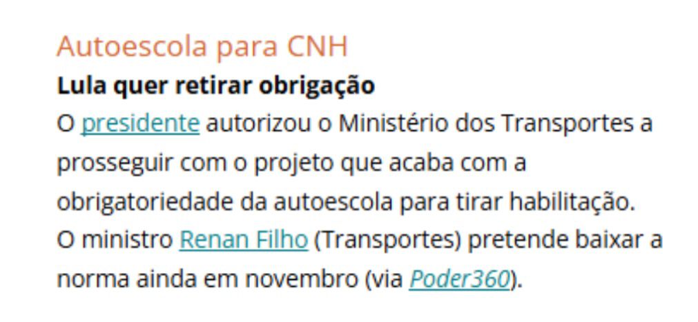Sinal verde ao fim da exigência de fazer autoescola – O presidente Luiz Inácio Lula da Silva autorizou, ontem, que o Ministério dos Transportes avance com o projeto que prevê o fim da obrigatoriedade de frequentar autoescolas para a obtenção da Carteira Nacional de Habilitação (CNH) — porém, a prova de conhecimentos teóricos e práticos para obter o documento continuarão obrigatórios. A proposta, conduzida pelo ministro Renan Filho, passará por um ciclo de audiências públicas a partir de hoje, que durará 30 dias. Atualmente, uma resolução do Conselho Nacional de Trânsito (Contran) exige 20 horas de aulas em autoescolas. Essa regra só poderia ser derrubada com a decisão presidencial, o que ocorre agora com o aval de Lula. A expectativa da pasta é que a nova norma entre em vigor em novembro, mas esse prazo pode se estender por conta de discussões no Conatran. Segundo o ministro, o custo elevado para obtenção da CNH — entre R$ 3 mil e R$ 4 mil — leva milhões de brasileiros a dirigir sem habilitação.