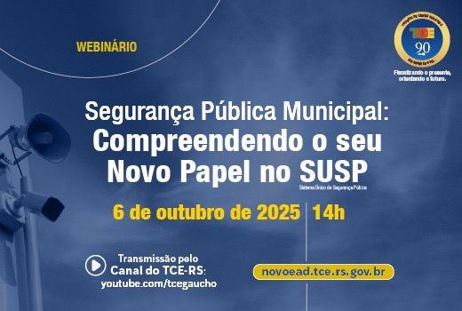 O Tribunal de Contas do Estado do Rio Grande do Sul (TCE-RS) realizará, no dia 6 de outubro, às 14h, o webinário “Segurança Pública Municipal: Compreendendo o seu Novo Papel no SUSP”. O encontro é voltado a gestores, servidores municipais e demais interessados na área de segurança pública. O evento tem como objetivo orientar sobre as responsabilidades crescentes dos