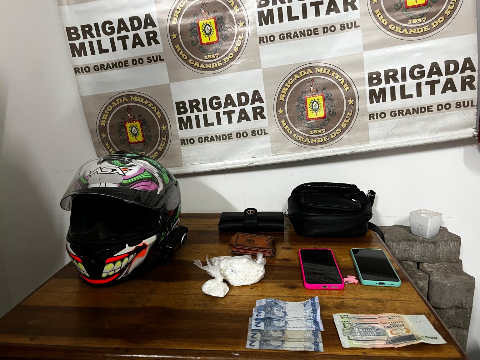 De acordo com as informações divulgadas pelas autoridades, além da droga, também foram apreendidos R$ 8,00 em dinheiro, 1.000 pesos, dois telefones celulares, uma carteira, uma bolsa e um capacete.
