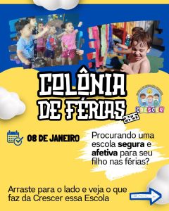 A colônia começa no dia 8 de janeiro de 2026 e atende crianças de 4 meses a 8 anos, em horário especial de verão, das 8h às 18h, com almoço incluído na diária. A Escola Crescer reforça seu compromisso com um ambiente seguro, amplo e climatizado, preparado para acolher as crianças com conforto e cuidado. O atendimento é individualizado, humanizado e conduzido por profissionais atentas e afetivas, garantindo que cada criança seja acolhida de forma integral.
