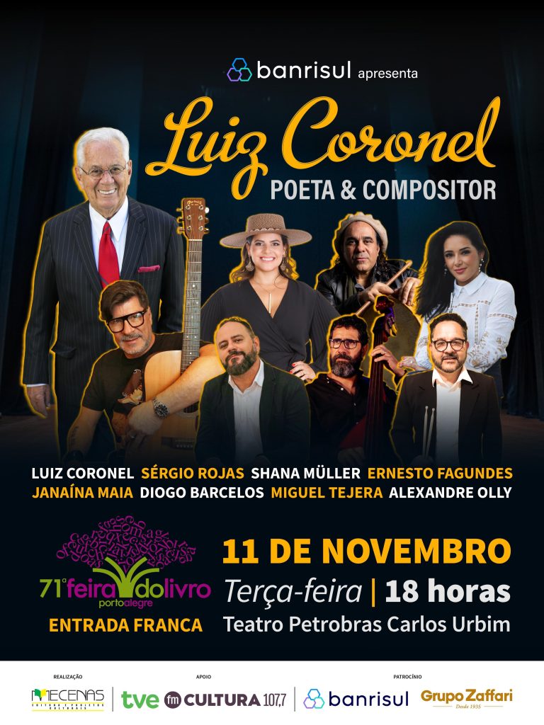 A 71ª Feira do Livro de Porto Alegre se prepara para receber um dos seus momentos mais aguardados e grandiosos: o espetáculo “Luiz Coronel – Poeta & Compositor”. O evento, que celebra a vasta e rica trajetória do artista, acontecerá no dia 11 de novembro, terça-feira, às 18 horas, no Teatro Petrobras Carlos Urbim. A entrada é franca.