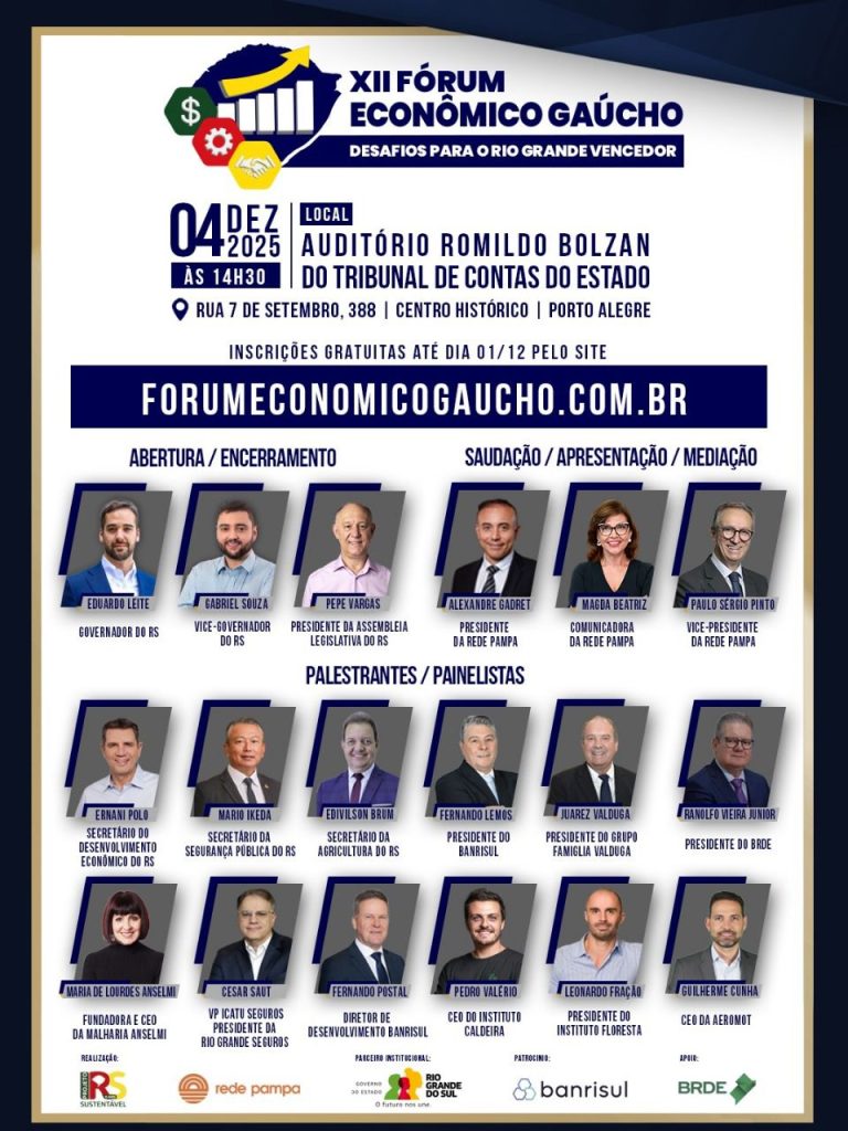 A Diretoria da Rede Pampa, o Secretário de Estado do Desenvolvimento Econômico, as Diretorias do Banrisul, e do BRDE, tem a honra de convidar para o “XII Fórum Econômico e que integra o Projeto Rio Grande Sustentável, a ser realizado no dia 4 de dezembro de 2025, às 14h30, conforme convite acima