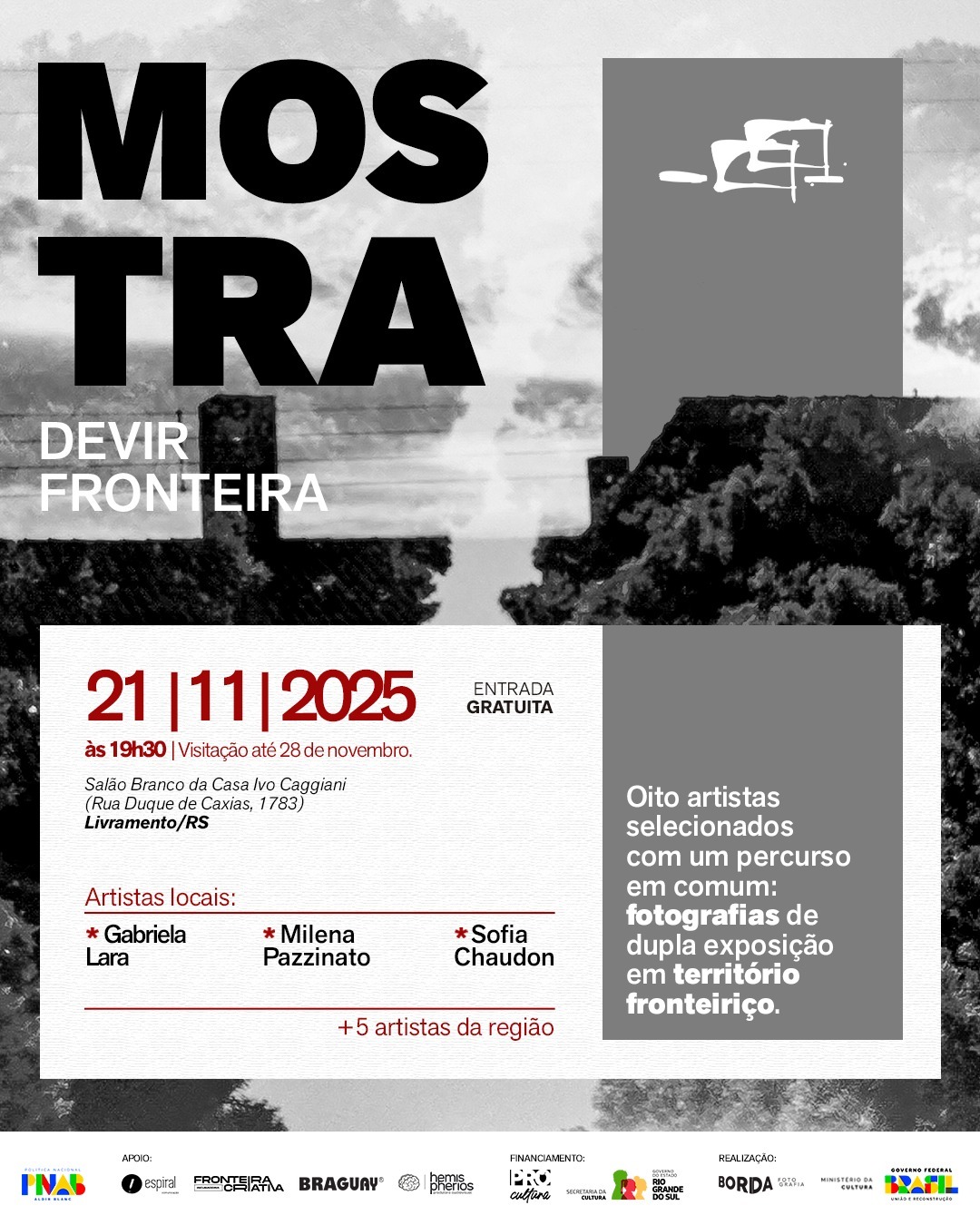 A mostra reúne oito artistas selecionados que compartilham um percurso em comum: fotografias de dupla exposição realizadas em território fronteiriço, explorando as conexões culturais e simbólicas entre Livramento e Rivera.