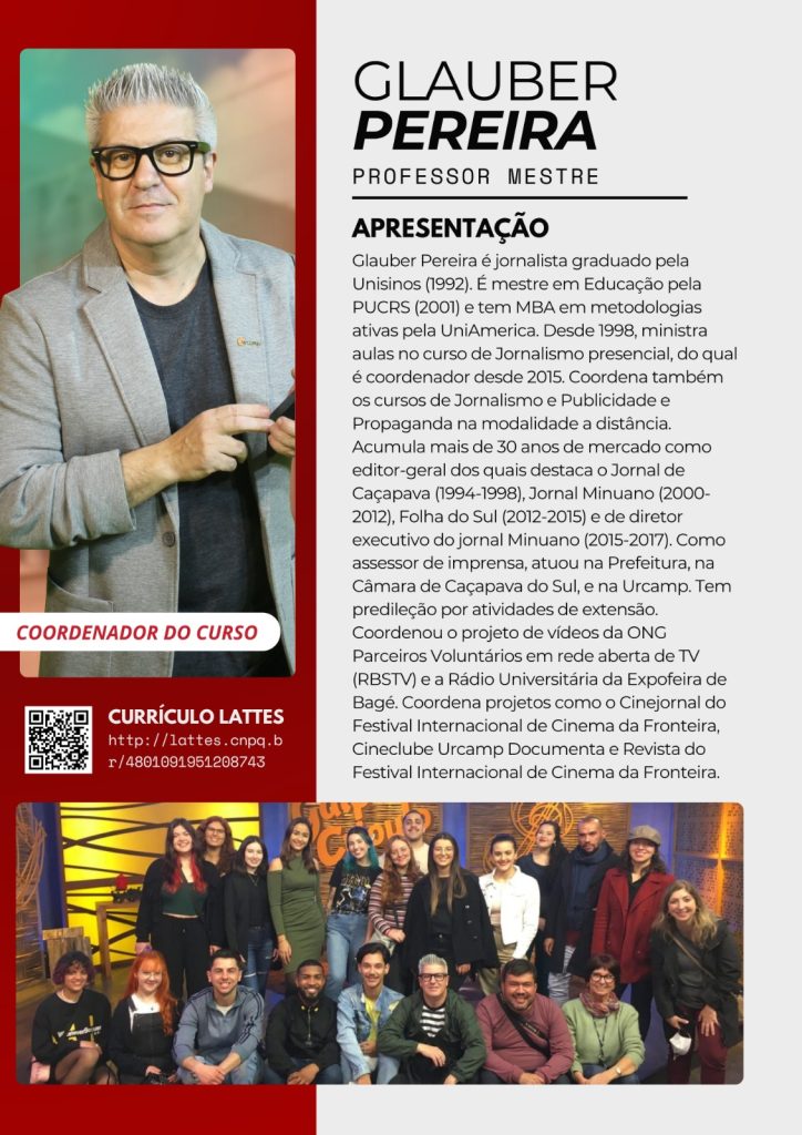 Glauber Pereira é jornalista graduado pela Unisinos (1992). É mestre em Educação pela PUCRS (2001) e tem MBA em metodologias ativas pela UniAmérica. Desde 1998, ministra aulas no curso de Jornalismo presencial, do qual é coordenador desde 2015. Coordena também os cursos de Jornalismo e Publicidade e Propaganda na modalidade a distância.