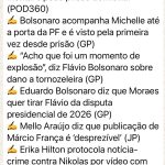 Michelle visita marido na prisão – Michelle Bolsonaro chegou à Superintendência Regional da Polícia Federal do Distrito Federal às 15h de ontem para visitar o marido. A entrada dela ocorreu após autorização expedida pelo ministro Alexandre de Moraes, do Supremo Tribunal Federal (STF). Michelle não estava em Brasília quando Bolsonaro foi detido, o que fez com que a defesa pedisse autorização expressa para que pudesse comparecer ao prédio da PF. Moraes atendeu ao pedido e determinou que a ex-primeira dama tivesse acesso ao local entre 15h e 17h de ontem, respeitando as regras internas da corporação e os limites estabelecidos para visitas.