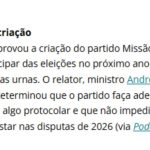 TSE aprova criação do Missão, partido do MBL – O TSE (Tribunal Superior Eleitoral) aprovou por unanimidade a criação do Missão, partido político ligado ao MBL (Movimento Brasil Livre). Com a aprovação, o partido poderá participar das eleições de 2026. O MBL já havia obtido do MPE (Ministério Público Eleitoral), em setembro, um parecer favorável à criação da legenda. Para o órgão, a sigla cumpriu as exigências necessárias —entre elas, a coleta de assinaturas e a elaboração do programa partidário. Os seis ministros seguiram voto do relator André Mendonça, que afirmou que a sigla obteve os números necessários para a criação. O MBL conseguiu mais de 589 mil assinaturas favoráveis —o número mínimo era 547.042. A nova legenda usará o número 14 nas urnas e se torna o 34º partido do Brasil. O coordenador do MBL e presidente do partido Missão, Renan Santos, deve ser o candidato da legenda à Presidência da República.