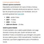 👥 Câmara aprova aumento gradual de licença-paternidade para até 20 dias; atualmente, o período de licença é de 5 dias; a aprovação foi simbólica, com votos contrários do deputado Kim Kataguiri e do Novo; o texto deve passar por uma nova análise do Senado