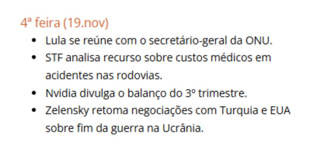 Resumo de quarta-feira, 19/11/2025