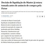 💲 Fictor Holding Financeira confirma suspensão da operação de compra do Master após liquidação decretada pelo Banco Central; negócio havia sido anunciado na segunda-feira (17) e ocorreria por meio de um consórcio com investidores dos Emirados Árabes Unidos