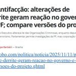 Governo x oposição – O papel da Polícia Federal no combate às facções do crime organizado tornou-se o principal ponto de disputa entre o governo e a oposição sobre o texto do PL Antifacção. Inicialmente, a proposta do relator, o deputado Guilherme Derrite (PP-SP), previa que a PF só atuaria contra determinados comportamentos das facções “por meio de provocação” dos governos estaduais. Essa posição provocou forte reação do Planalto, que acusou o texto de querer impedir a ação da PF. A própria PF emitiu uma nota expressando “preocupação”. Já no fim da noite, Derrite, divulgou uma nova versão, antecipando que a PF pode agir “por iniciativa própria”, mas “por meio de comunicação às autoridades estatais”. Outro ponto polêmico é a introdução, na Lei Antiterrorismo, de comportamentos típicos de facções. Isso pode abrir uma lacuna, segundo especialistas, para a equalização legal entre os dois tipos de organizações criminosas.