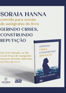 A jornalista Soraia Hanna, sócia-diretora executiva da Critério – Resultado em Opinião Pública, autografa neste sábado (15), na Feira do Livro de Porto Alegre, seu livro “Gerindo crises, construindo reputação”. O lançamento ocorrerá às 18h, na Praça de Autógrafos Maurício Sirotsky Sobrinho.