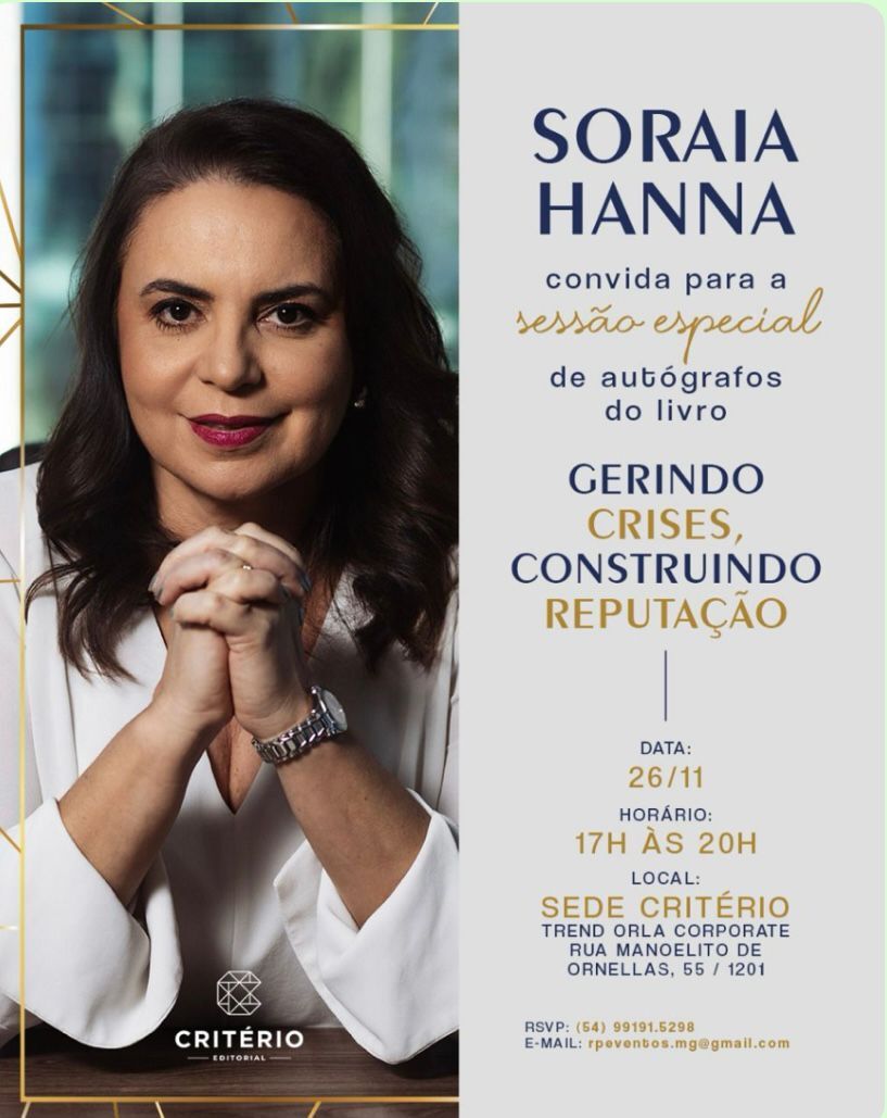 A especialista em gestão de crises e reputação, Soraia Hanna, promove nesta terça-feira (26) uma sessão especial de autógrafos para marcar o lançamento de seu livro “Gerindo Crises, Construindo Reputação”. O evento será realizado das 17h às 20h, na sede da Critério, no Trend Orla Corporate, localizado na Rua Manoelito de Ornellas, nº 55, sala 1201.