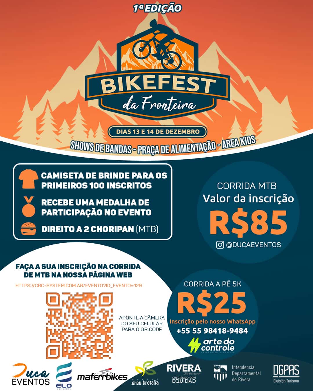 O evento combina a paixão pelo esporte com a competição. Serão realizadas duas modalidades principais: a Corrida MTB (Mountain Bike), com valor de inscrição de R$ 85,00, e a Corrida a Pé 5K, com inscrição de R$ 25,00. Para os participantes da Corrida MTB, há incentivos especiais: os primeiros 100 inscritos receberão uma camiseta de brinde, além de medalha de participação no evento e direito a dois choripan.