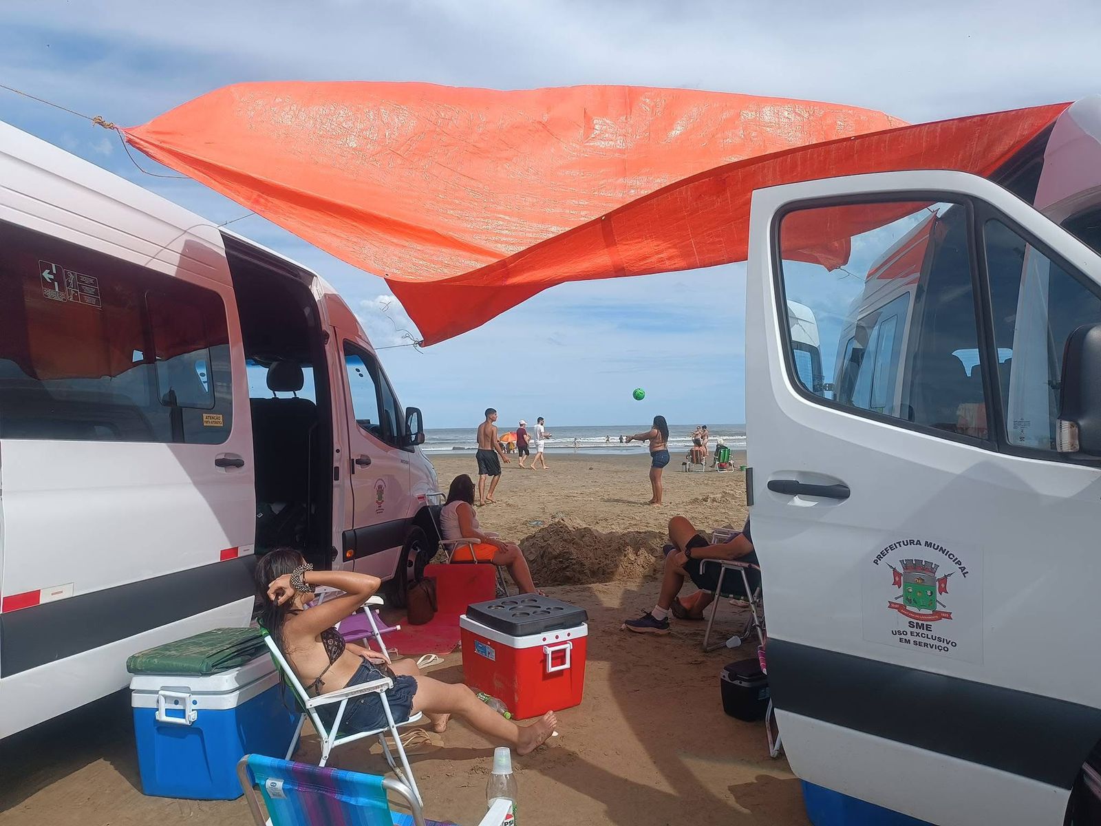 A redação do Jornal A Plateia recebeu, neste sábado (13), duas fotografias registradas em uma praia do litoral do Rio Grande do Sul, nas quais aparecem vans com o logotipo oficial da Prefeitura de Sant’Ana do Livramento, identificadas como de uso institucional. As imagens mostram os veículos estacionados na areia, com pessoas utilizando cadeiras e estruturas de apoio próximas, o que levantou dúvidas sobre a finalidade da presença dos automóveis no local.