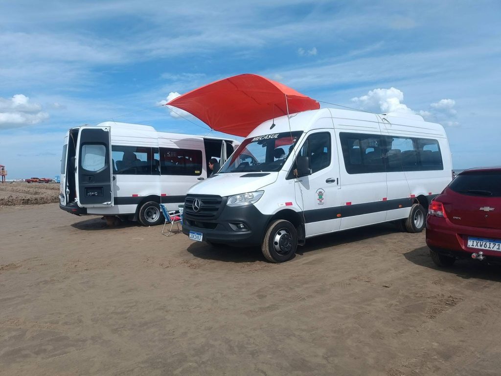 A redação do Jornal A Plateia recebeu, neste sábado (13), duas fotografias registradas em uma praia do litoral do Rio Grande do Sul, nas quais aparecem vans com o logotipo oficial da Prefeitura de Sant’Ana do Livramento, identificadas como de uso institucional. As imagens mostram os veículos estacionados na areia, com pessoas utilizando cadeiras e estruturas de apoio próximas, o que levantou dúvidas sobre a finalidade da presença dos automóveis no local.