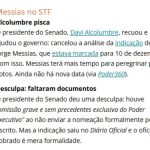 🇧🇷👥 Alcolumbre cancela sabatina de Messias por “grave omissão” do Executivo; o presidente do Senado acusou o governo de “grave omissão” por não enviar a mensagem oficial à Casa com o nome de Messias, apesar de já ter oficializado a indicação no Diário Oficial da União (DOU)
