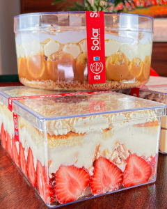 Entre as opções estão: Chajá de Pêssego, Chajá de Morango, Banoffee, Pistache Bombom, Tiramisù, Chocotorta e Cheesecake de Morango. Cada sobremesa é cuidadosamente embalada em caixas elegantes e delicadas, pensadas para encantar desde o primeiro olhar. A apresentação reforça o compromisso do Solar em transformar cada encomenda em uma experiência que une sabor, beleza e cuidado.