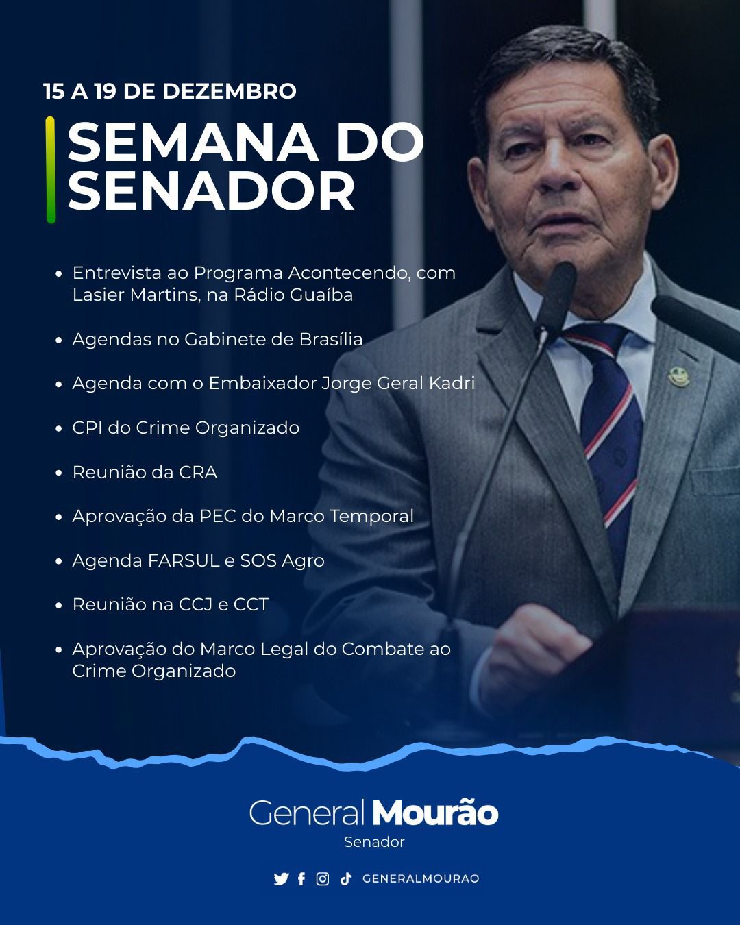 Entre os dias 15 e 19 de dezembro, o senador destacou uma agenda intensa em Brasília, marcada por entrevistas, reuniões estratégicas e votações de pautas relevantes para o país. A programação foi divulgada em suas redes sociais.