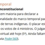 MARCO TEMPORAL – Com votos de Toffoli e Moraes, o STF formou maioria (6 a 0) pela inconstitucionalidade da lei que demarca terras indígenas.