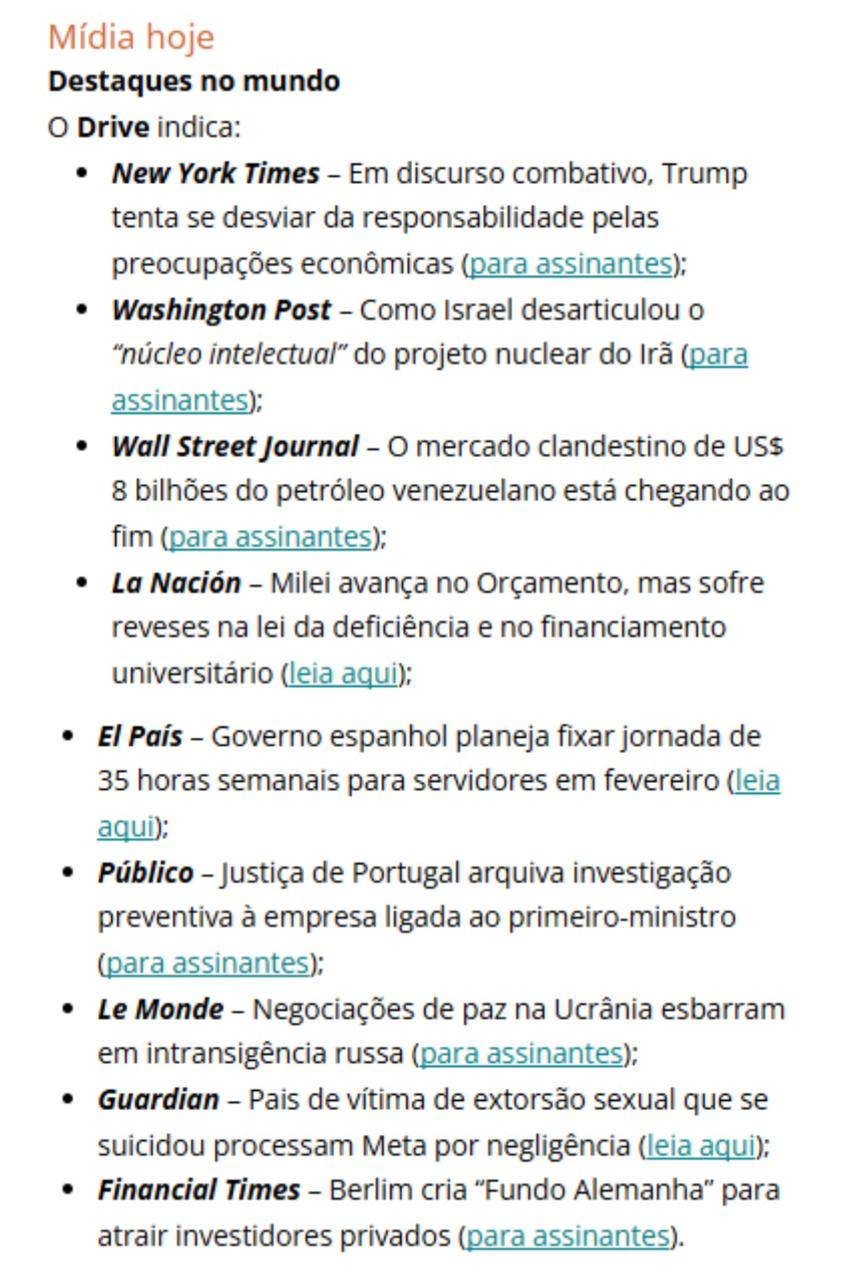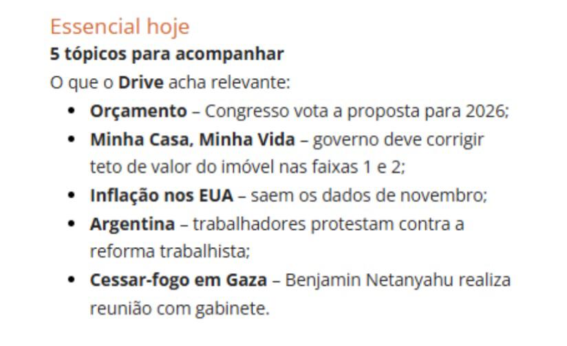 … Dia cheio para os mercados globais, com reuniões do BCE, BoE e, nos Estados Unidos, o CPI de novembro. Aqui, o BC divulga o Relatório de Política Monetária (RPM), com entrevista do presidente Gabriel Galípolo (11h) para comentar os dados. Em clima de final de ano, Lula tem café da manhã com jornalistas. No Senado, o governo abriu a guarda e deixou passar o PL da Dosimetria em acordo com a oposição para aprovar o projeto que decidiu um corte de 10% dos benefícios fiscais e elevou a tributação de JCP, fintechs e bets. A proposta, que aumenta a arrecadação em mais de R$ 20 bilhões, é crucial para fechar o Orçamento de 2026, que deve ser votado hoje no Congresso.