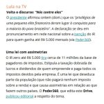 🇧🇷 Lula defende combater “privilégio de poucos” em pronunciamento nacional; na noite deste domingo (30), o presidente brasileiro fez um pronunciamento em rede nacional no qual repetiu a estratégia de atingir as camadas de menor renda da população e criar uma espécie de “luta de classes”; o principal tema da fala foi a recente sanção do governo do projeto que amplia a faixa de isenção do Imposto de Renda; a medida isenta quem ganha até R$ 5 mil por mês e reduz a alíquota de contribuintes com rendas entre R$ 5 mil e R$ 7.350