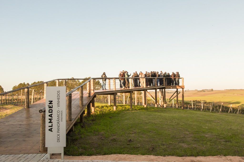 Visitantes contemplam a beleza das parreiras da Almadén, cenário perfeito para fotos e momentos ao ar livre.