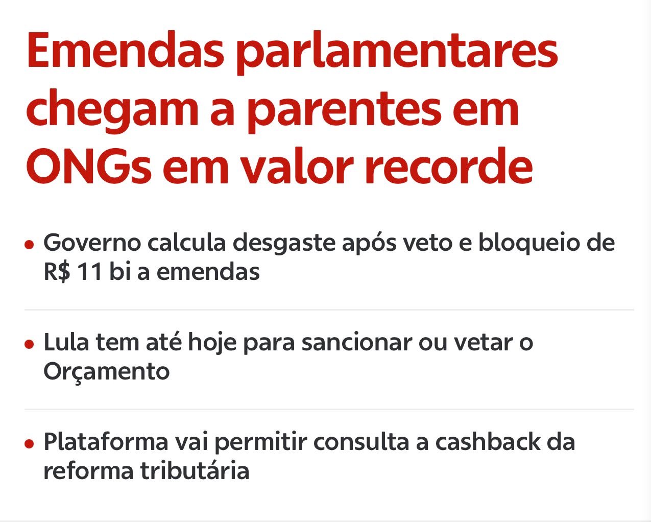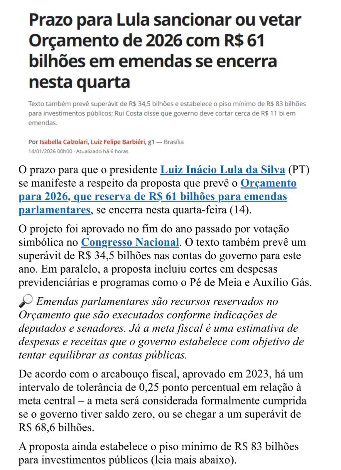 🇧🇷 Lula tem até hoje para sancionar LOA (Lei Orçamentária Anual) de 2026; governo estuda veto a emendas; Planalto avalia que destino dará para cerca de R$ 11 bilhões em emendas inscritas entre verbas da União; executivo não descarta vetar trechos da peça orçamentaria