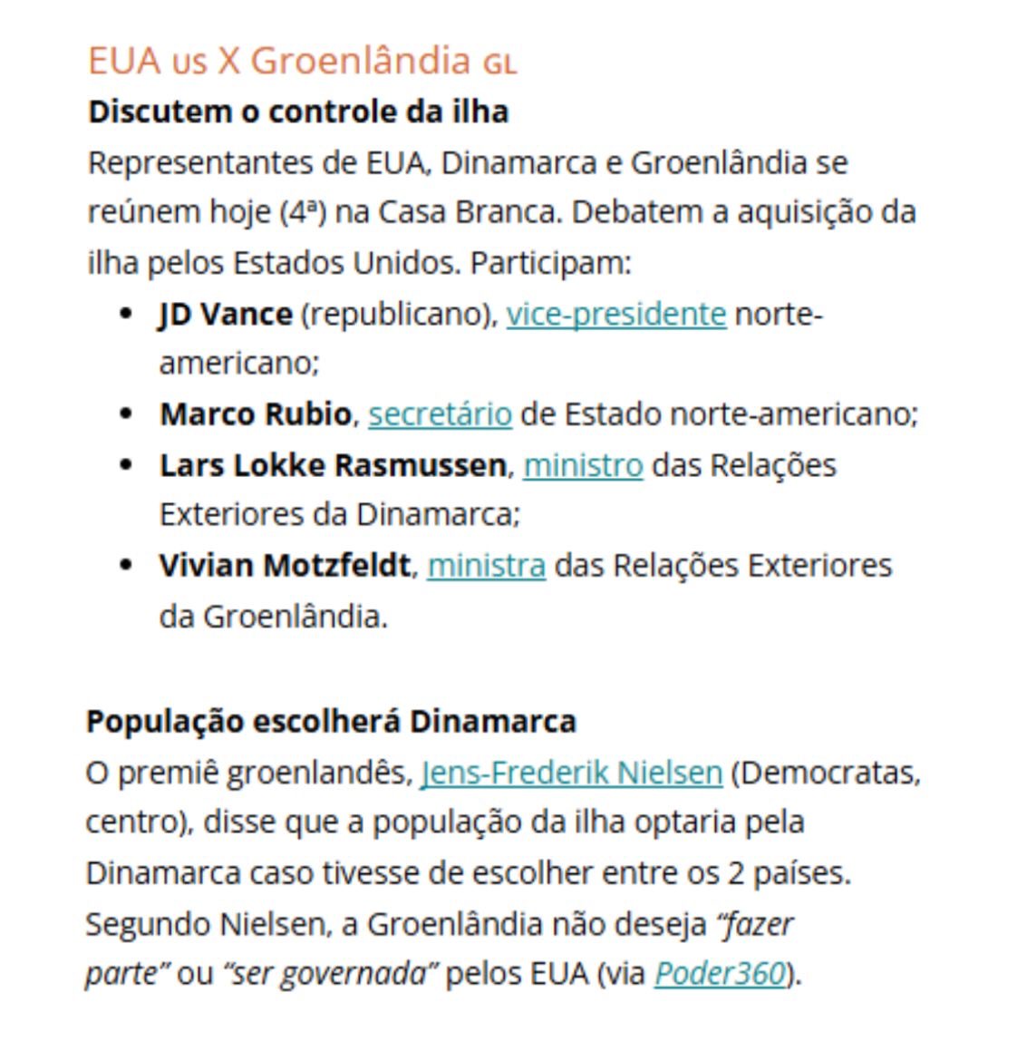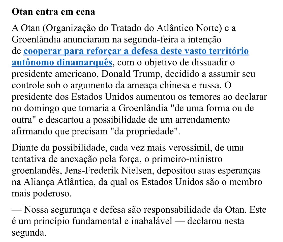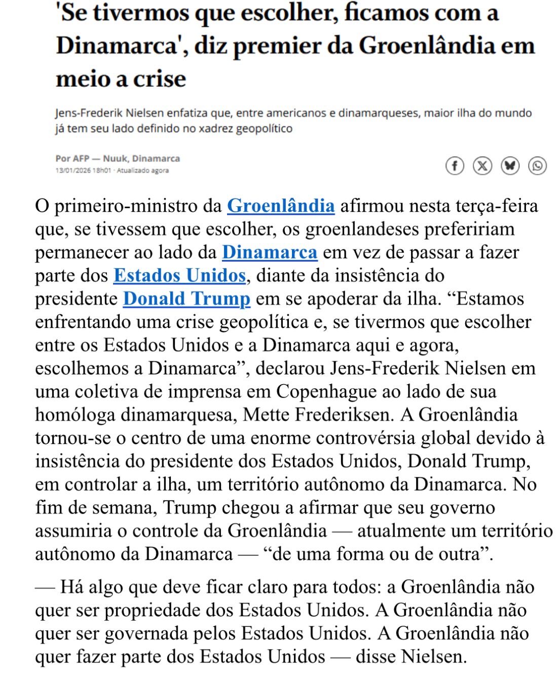 🇬🇱🇩🇰 Premiê da Groenlândia, Jens-Frederik Nielsen, volta a rejeitar anexação dos EUA: “Escolhemos a Dinamarca”; na segunda-feira (12), o governo groenlandês já havia manifestado sua rejeição a qualquer possibilidade do governo de Donald Trump de anexar a ilha ártica, além de ter anunciado que a Otan intensificará seus esforços de defesa na região, visto que a ilha “é parte do Reino da Dinamarca”