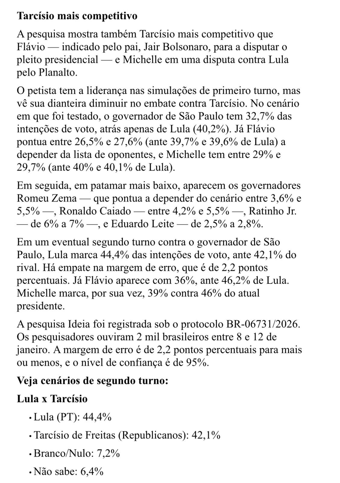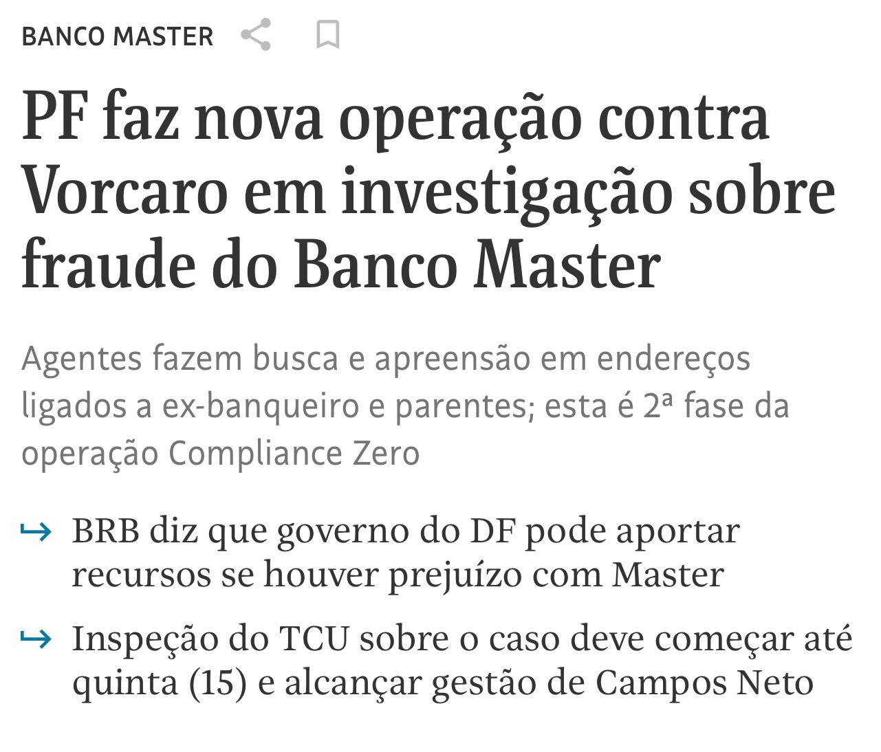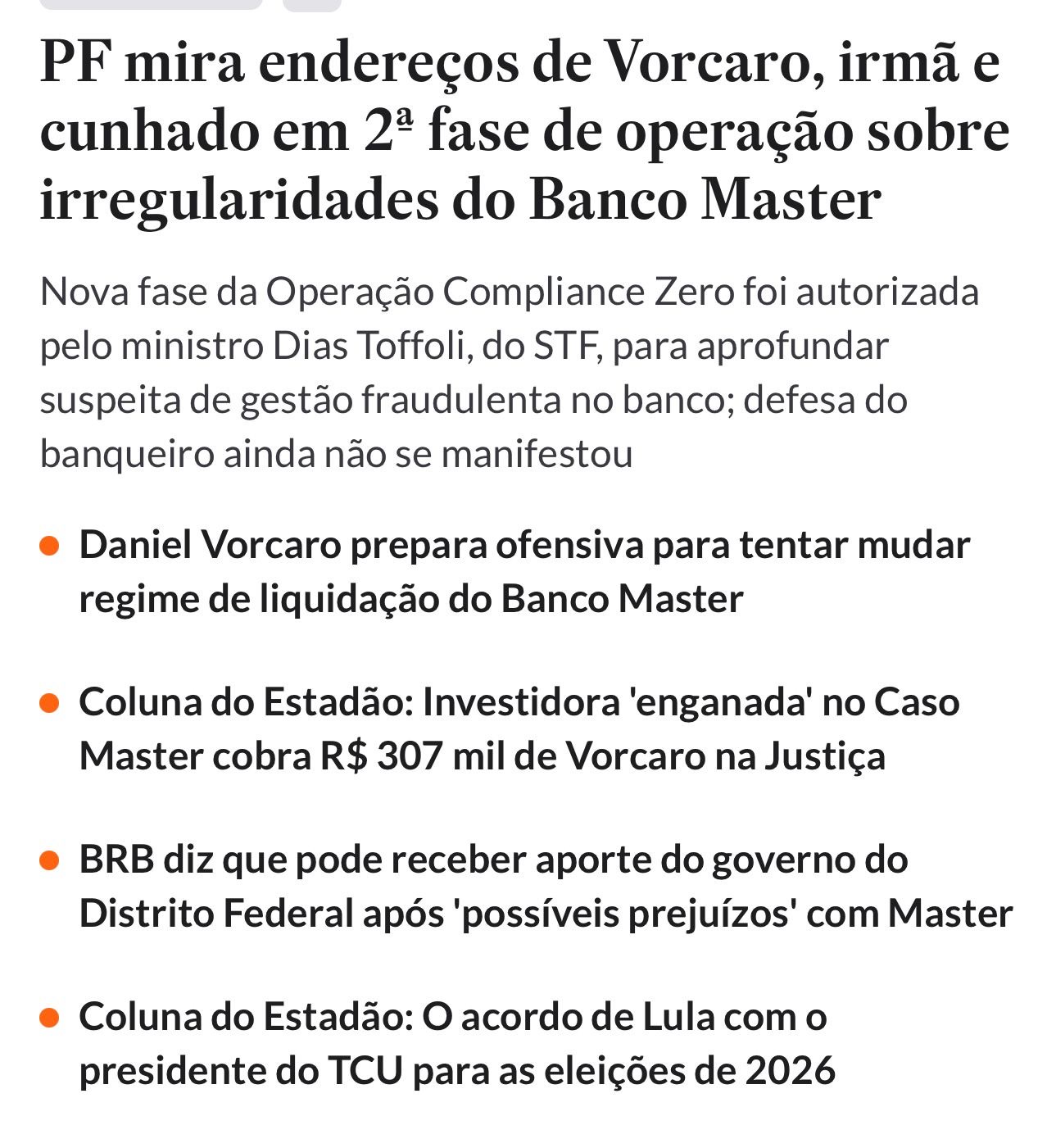 👥 Ministério Público junto ao Tribunal de Contas da União (MP-TCU) questiona indicação de Otto Lobo, por Lula, à Comissão de Valores Mobiliários (CVM) por decisões favoráveis ao Banco Master; o banco é alvo de investigação da Polícia Federal pela venda de carteiras de crédito fraudulentas no valor de R$ 12 bilhões ao Banco de Brasília (BRB)