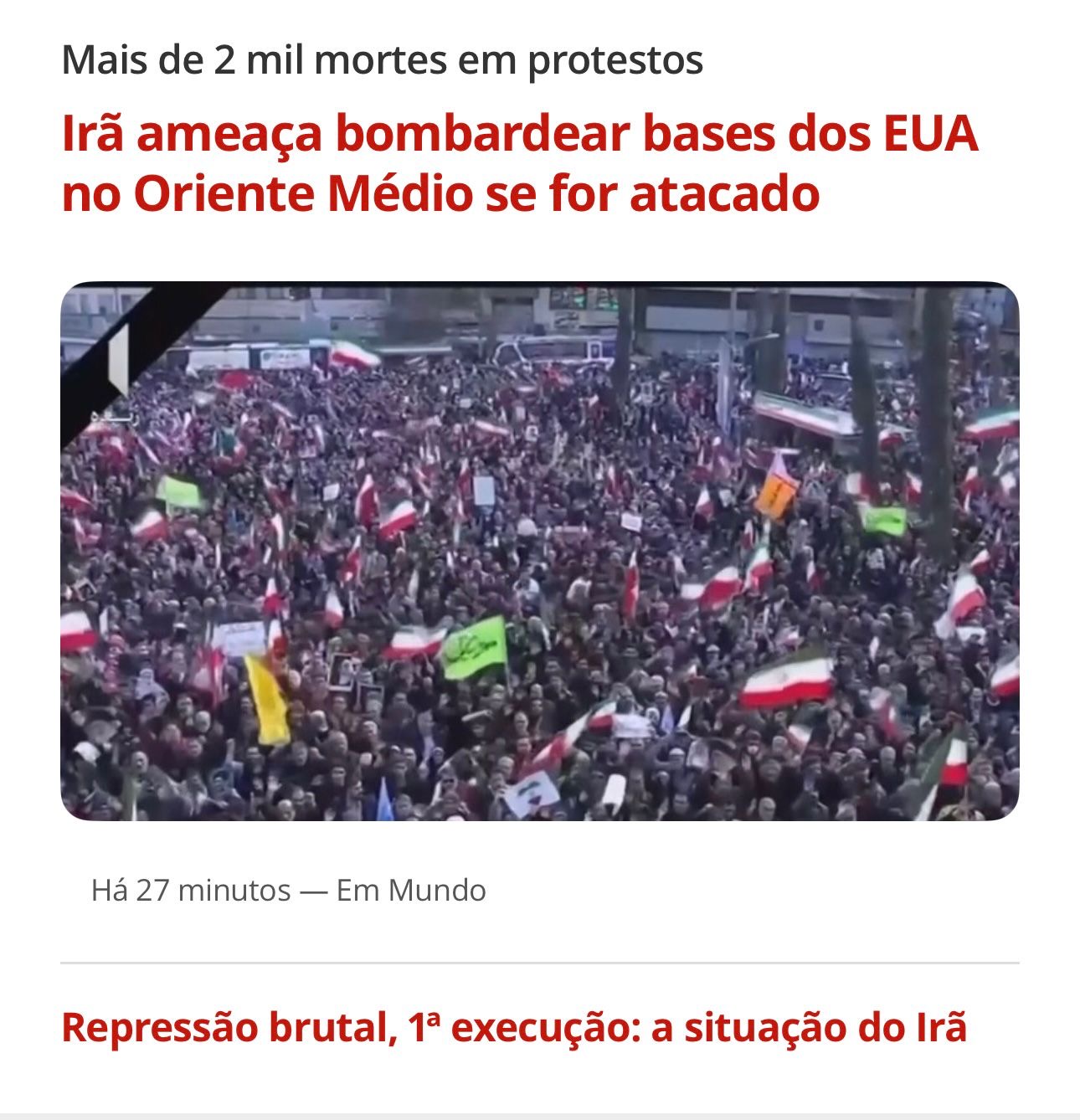 🇮🇷👥 Número de mortos em protestos no Irã passa de 2.000, diz organização; mais cedo, a HRNA havia informado que 16.784 pessoas foram presas nas manifestações que ocorrem em todo o país há mais de duas semanas