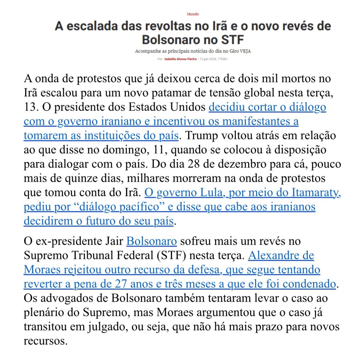⚖️ Moraes rejeita recurso da defesa e mantém execução da pena de Bolsonaro; a defesa havia protocolado o recurso na segunda-feira (12), pedindo que fosse revertida a decisão monocrática anterior de Moraes, que havia rejeitado a tramitação de embargos infringentes; diante do esgotamento das vias recursais, o ministro declarou o trânsito em julgado do processo em 25 de novembro de 2025, com início imediato da execução penal, medida que foi posteriormente referendada pela Corte