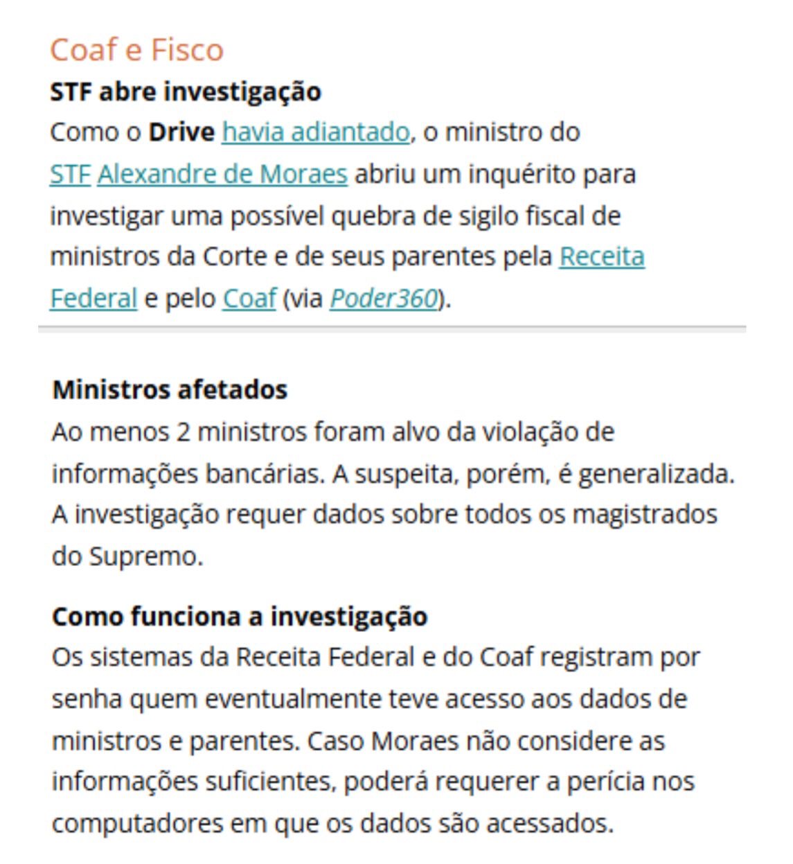 ⚖️ Moraes instaura inquérito para investigar vazamento de dados de familiares e de ministros do STF; ao menos dois dos 11 magistrados teriam sido diretamente atingidos, embora a investigação tenha caráter amplo e inclua dados relacionados aos 11 integrantes do STF; a Receita e o Coaf teriam sido oficialmente acionados para esclarecer quem acessou as informações protegidas, já que todos os acessos ficam registrados por meio de logs e senhas internas