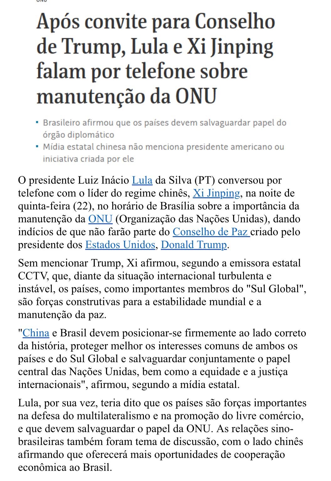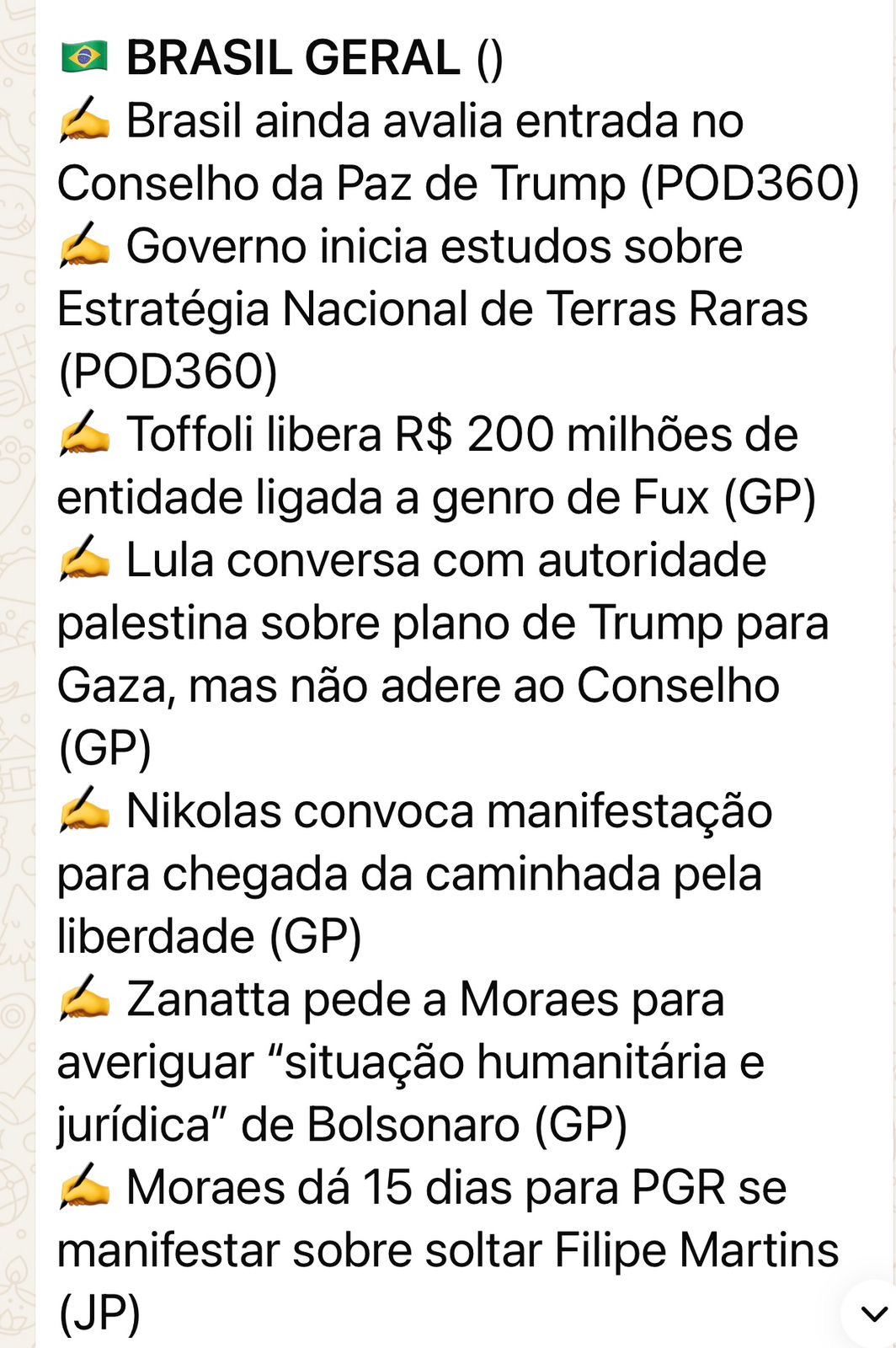CONSULTAS sobre Conselho da Paz – O presidente Luiz Inácio Lula da Silva tem consultado aliados para decidir se participa do Conselho de Paz, criado na quinta-feira pelos Estados Unidos para mediar o conflito entre Israel e Hamas e supervisionar a reconstrução da devastada Faixa de Gaza. A criação do grupo faz parte da estratégia do cessar-fogo do conflito, mediado pelos EUA, em setembro do ano passado. Além do Brasil, países como Argentina, Canadá, Índia, Turquia e Itália foram convidados pelo presidente dos EUA, Donald Trump, a integrar o conselho. Segundo fontes do Ministério das Relações Exteriores, o Brasil tem discutido com país aliados que também foram convidados a integrar o grupo. Interlocutores do Itamaraty afirmaram, porém, não saber quais chefes de Estado Lula já contatou. Segundo o Planalto, o presidente fez ligações para três líderes entre quarta-feira e ontem.