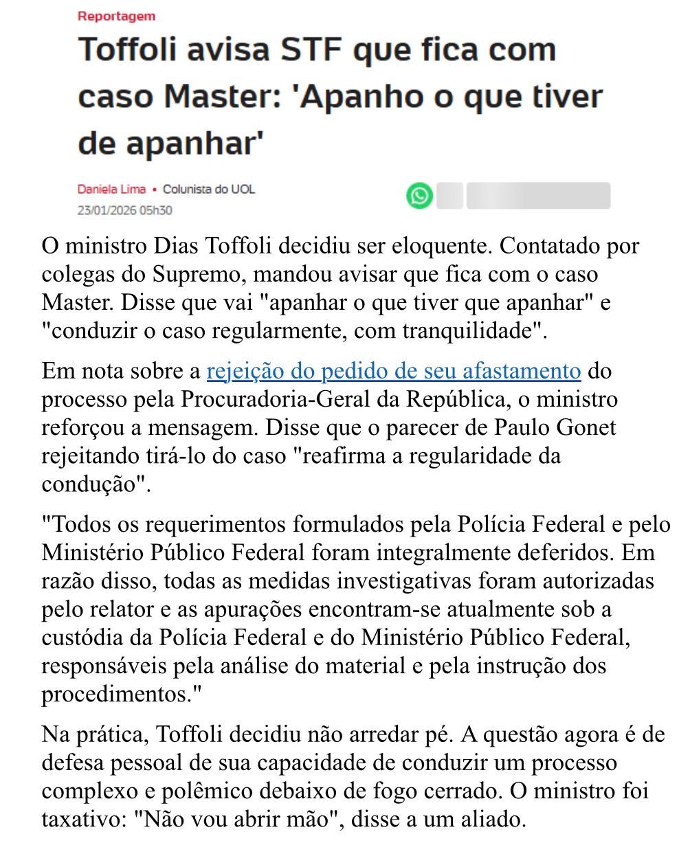 A ESFINGE – Os políticos estão fazendo fila para tentar uma conversa com o ministro Dias Toffoli, relator do caso Master/BRB. Até aqui, o ministro está “fechado em copas”. Não recebeu ninguém. Aliás, ele foi escolhido relator por sorteio. E, conforme o leitor da coluna já sabe, não abrirá mão da relatoria e vai trabalhar no caso em silêncio.