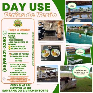 O espaço oferece experiências tanto para quem deseja passar o dia quanto para quem prefere prolongar a estada. Uma das opções é o Day Use, disponível de terça a domingo, ideal para famílias que querem aproveitar momentos ao ar livre. O parque conta com piscinas (adulto e infantil), área de lazer, lago para pesca de lambari e churrasqueira, permitindo que os visitantes façam seu próprio churrasco em meio a um cenário rural acolhedor.
