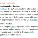🇪🇺 Europa reforça segurança no Ártico em apoio à Groenlândia após ameaças de Trump; Dinamarca, Alemanha, França, Reino Unido, Noruega, Suécia, Finlândia e Países Baixos divulgaram um comunicado conjunto neste domingo (18); o grupo reafirmou o compromisso com a defesa da Groenlândia, território semiautônomo sob soberania dinamarquesa