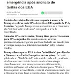 🇪🇺🇺🇸 União Europeia avalia responder Trump com tarifas de até 93 bilhões de euros, diz jornal; a medida é uma resposta à pretensão do presidente dos EUA, Donald Trump, de anexar ou comprar a Groenlândia, segundo informou o jornal Financial Times neste domingo (18)
