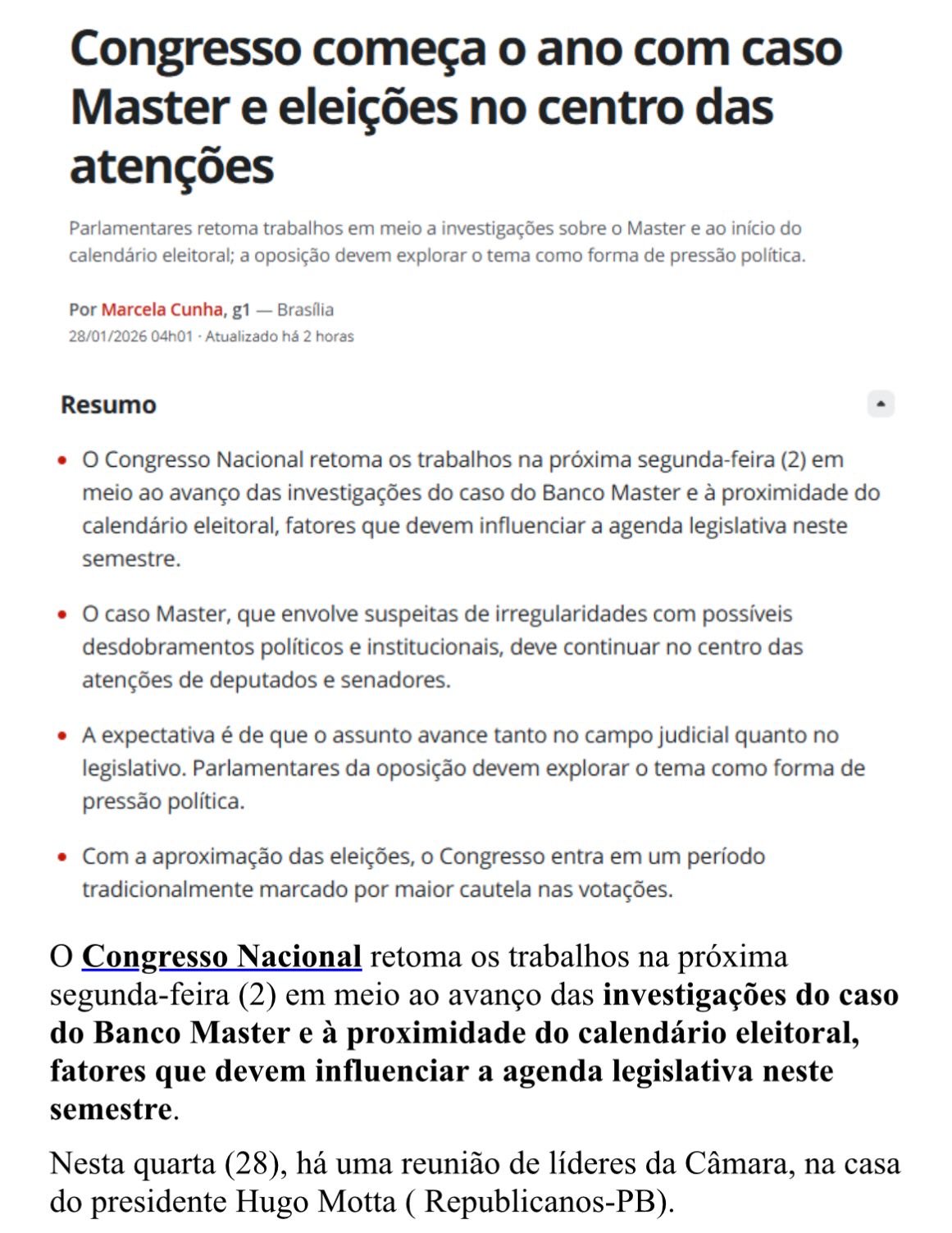 🚔 Polícia Federal cancela três depoimentos do caso Master; diretor é ouvido; os depoimentos foram cancelados após pedidos das defesas, que alegaram que não tiveram tempo suficiente para ler os autos do processo, liberados na semana passada