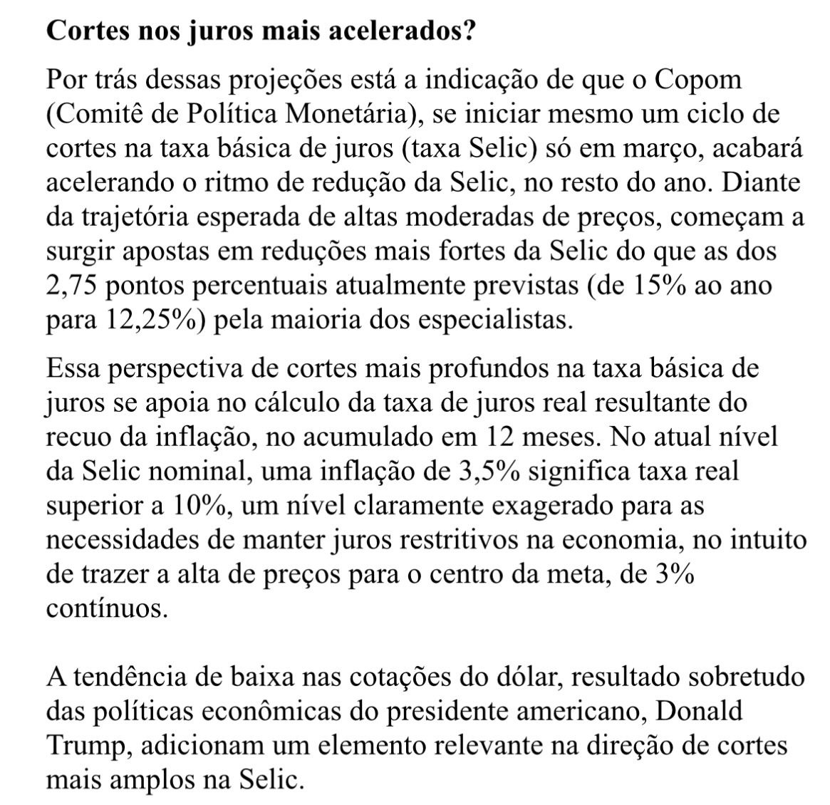 QUEDA feia – As políticas erráticas de precificação do presidente dos EUA, Donald Trump, fizeram o dólar perder valor globalmente. Em relação ao real, a queda foi de 1,26% ontem, acumulando uma perda de 5,2% em janeiro, fechando em R$ 5,20, o menor preço em quase dois anos. O efeito Trump também leva os investidores a buscarem outros mercados, o que explica os recordes subsequentes de Ibovespa, com um novo recorde (1,79%) ontem. A previsão de inflação de janeiro foi de 0,20%, ligeiramente abaixo das expectativas do mercado, e segue a expectativa de que o banco central manterá as taxas de juros em 15% na reunião de hoje do Copom.