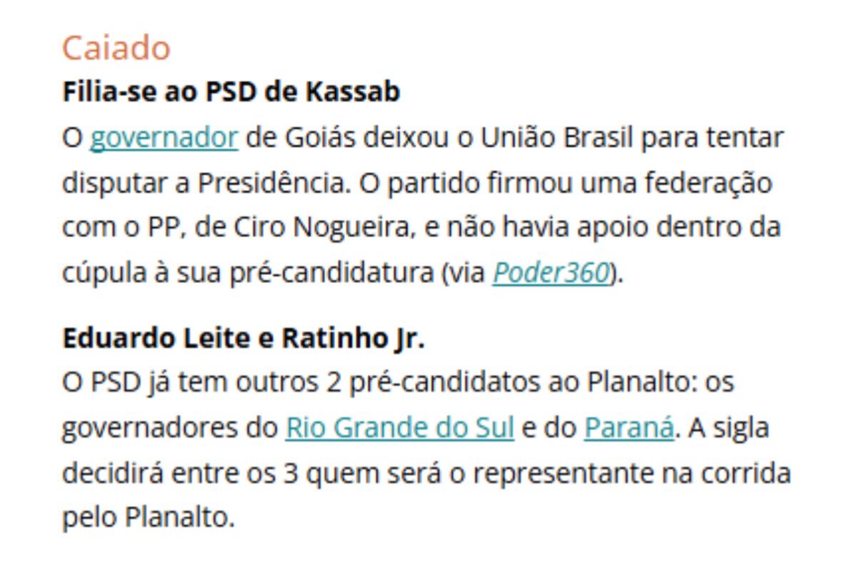 CAIADO deixa União Brasil – O governador de Goiás, Ronaldo Caiado (União Brasil), informou, ontem, que está se filiando ao PSD para tentar disputar a Presidência da República. A decisão foi comunicada, à noite, pelas redes sociais, após conversas com o presidente do União, Antônio Rueda, e com o vice-presidente, ACM Neto. “Vivo hoje um importante momento na minha trajetória. Ao lado dos governadores Ratinho Junior e Eduardo Leite, estou sendo muito bem recebido no PSD, onde assino minha nova filiação partidária”, disse ele. Em relação às eleições, o gover ador declarou que ter somente um representante da direita na disputa favoreceria o governo atual. De acordo com ele, com vários candidatos na oposição, o petista teria que descentralizar os alvos, facilitando uma possível vitória da direita.