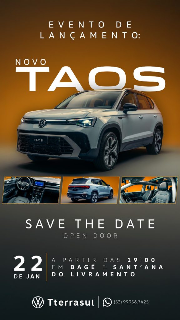 A Volkswagen realiza nesta quinta-feira, dia 22 de janeiro, a partir das 19h, o evento oficial de lançamento do Novo Taos 2026, um dos modelos mais aguardados da marca, que chega ao mercado com visual atualizado, tecnologia ampliada e novos sistemas de assistência à condução.