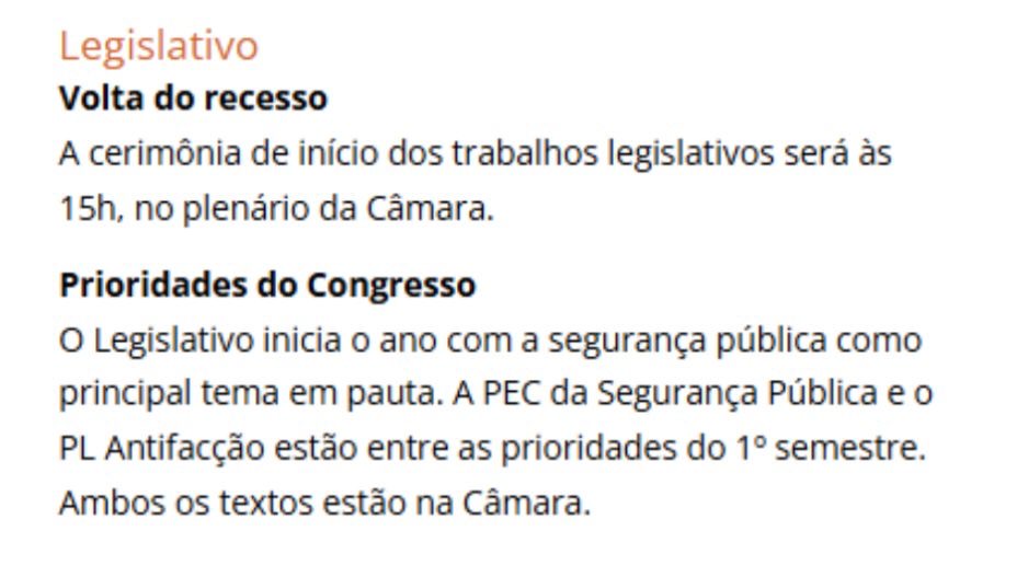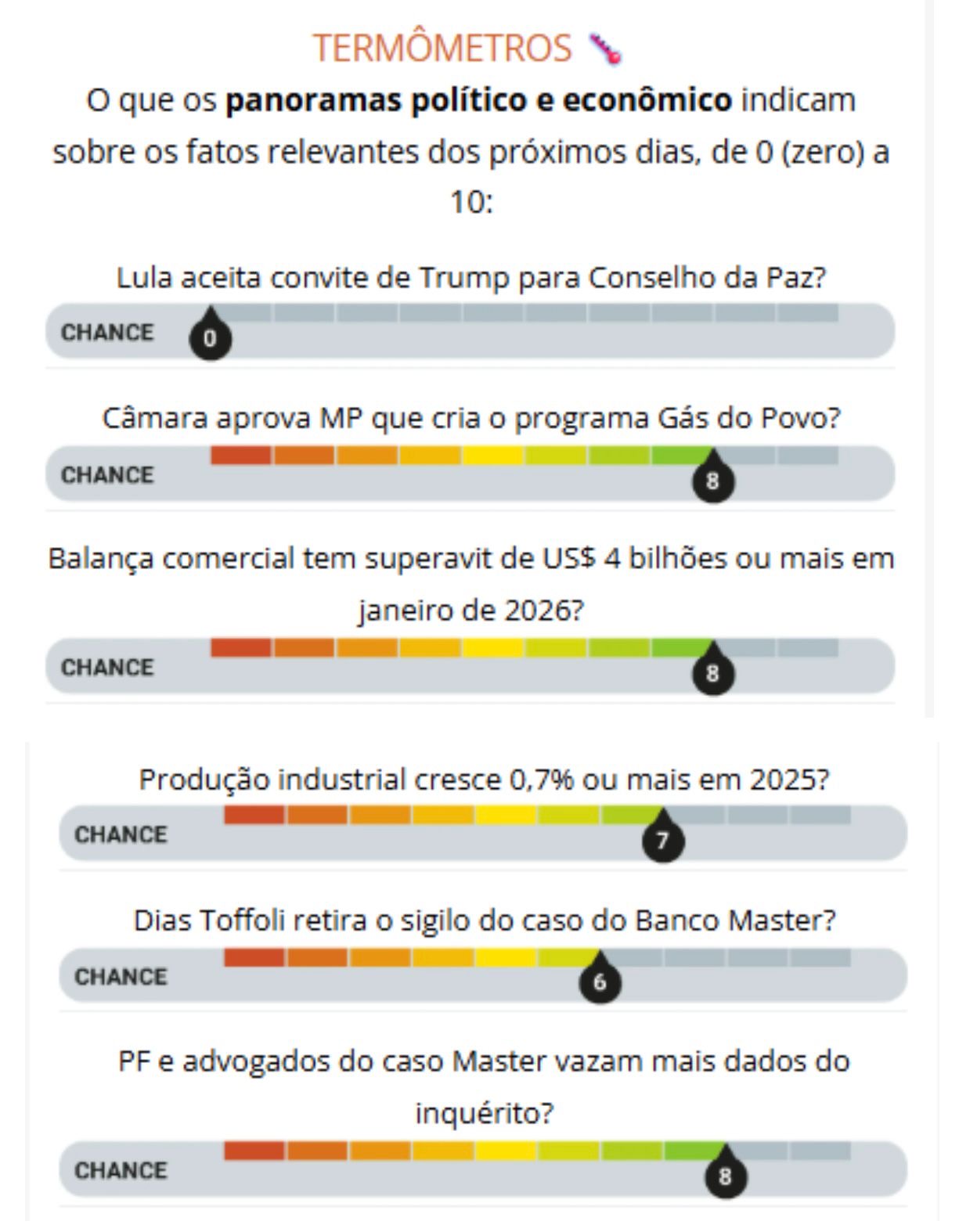 O RETORNO – O Congresso retoma o trabalho hoje após o recesso com o governo interessado em aprovar pautas de apelo eleitoral, mas sob pressão da base aliada reduzida e de uma série de vetos presidenciais a serem analisados. A prioridade do Planalto, a MP chamada de “Gás do Povo”, que garante botijão de gás gratuito para baixa renda, expira em 11 de fevereiro e deve ser votada imediatamente. A perspectiva é menos favorável para outras agendas, como o PEC da Segurança e o PL Antifacção. O Congresso pode ainda derrubar vários vetos de Lula, como bloquear a chamada dosimetria criminal para os condenados pelo golpe e 8 de janeiro. Outro ponto de preocupação no Planalto é uma possível CPI do Master controlada por opositores.