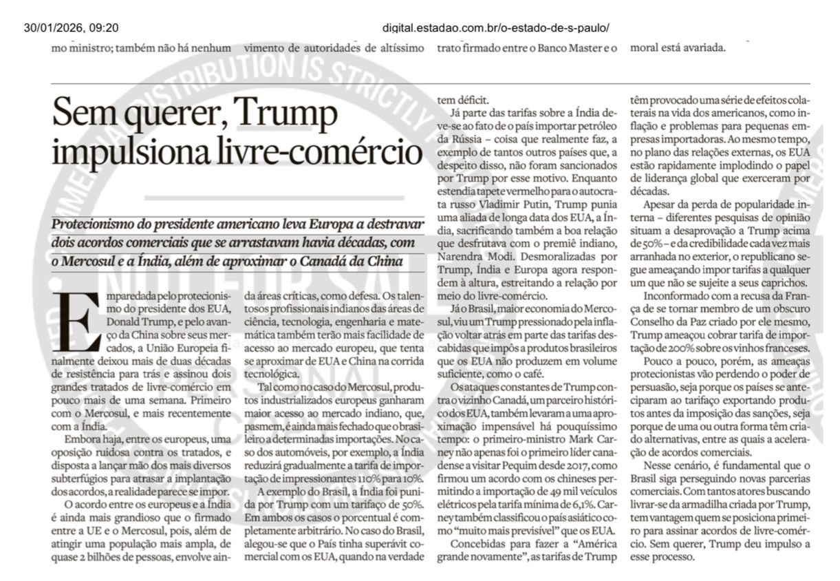 GRAÇAS a Trump – As políticas tarifária e de relações externas do presidente americano, Donald Trump, tornaram-se ingrediente adicional ao avanço dos chineses e de outros asiáticos em busca de novos mercados, e contribuíram para a importação brasileira ficar mais concentrada nos países do Extremo Oriente pós-pandemia. A participação dos asiáticos nas compras brasileiras aumentou de 33,6% em 2019 para 38,9% em 2025. O avanço de 5,3 pontos percentuais contrasta com a perda de fatia de outras regiões no período. A União Europeia teve perda de participação nas importações brasileiras de 0,9 ponto percentual, o Oriente Médio caiu 0,2 p.p. e a África, 0,1 p.p., assim como a Oceania. Na exportação, as variações foram menores. Destino de 43,1% dos embarques brasileiros em 2025, a Ásia aumentou sua fatia em 0,9 p.p. no ano passado ante 2019. No caso de vendas para a África houve aumento de 1 p.p., e para a UE, de 0,7 p.p..