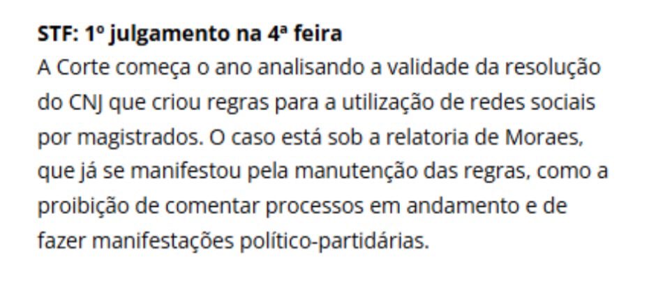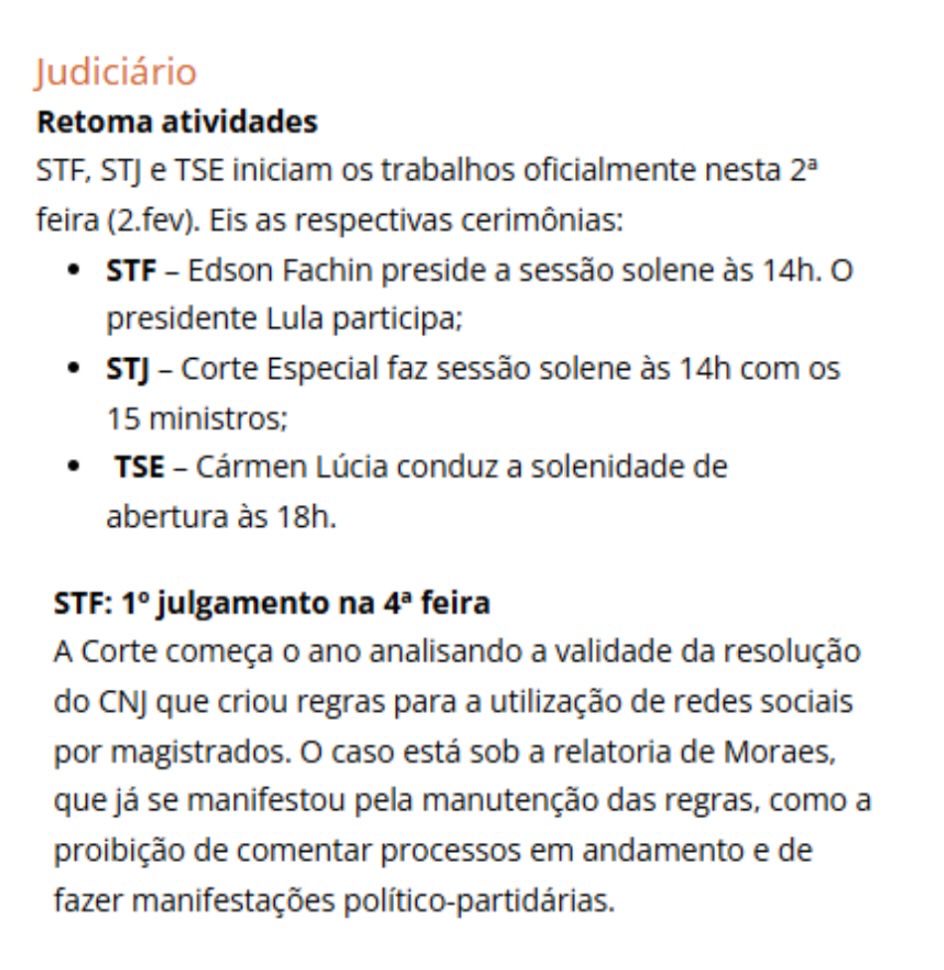 APOIO ao código – Mais de 50 entidades da sociedade civil anunciaram apoio ao manifesto assinado em dezembro por mais de 200 pessoas, incluindo empresários, economistas e outros nomes de segmentos diversos, que pede que o STF (Supremo Tribunal Federal) adote um código de conduta para os ministros da corte. A ação também conta com uma petição online, que soma mais de 45 mil assinaturas. O documento destaca a preocupação de parcelas da sociedade “com a necessidade de normas claras de comportamento e integridade para magistrados das mais altas cortes do país”, propondo diretrizes baseadas em “boas práticas de independência judicial”.