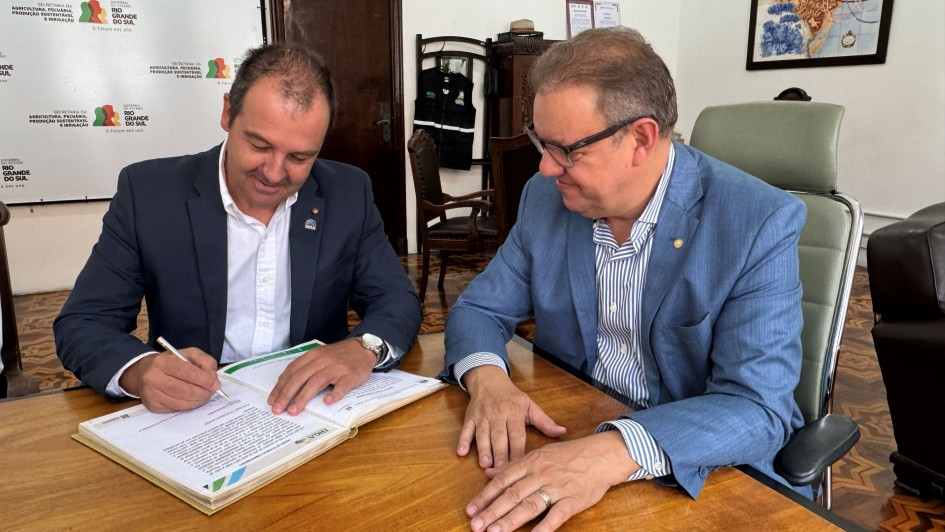 O novo presidente do Instituto Rio Grandense do Arroz (Irga), Alexandre Velho, e o secretário da Agricultura, Pecuária, Produção Sustentável e Irrigação (Seapi), Edivilson Brum, se reuniram nesta segunda-feira (9/2) para o ato simbólico de assinatura do termo de posse como presidente da instituição.