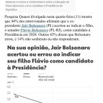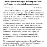 FLÁVIO Bolsonaro se consolida como principal adversário de Lula – Filho do ex-presidente Jair Bolsonaro (PL), o senador Flávio Bolsonaro (PL-RJ) se consolidou como principal opositor do presidente Lula (PT) para as eleições de 2026, segundo nova pesquisa Genial/Quaest divulgada nesta quarta-feira (11). O petista segue na liderança em todos os cenários de primeiro turno testados pelo levantamento, com intenções de voto entre 35% e 39%. Em todos eles, Flávio assegura, com folga, o segundo lugar, com percentuais que variam de 29% a 33%. A pesquisa foi feita de quinta (5) até segunda-feira (9). Foram 2.004 entrevistas com brasileiros de 16 anos ou mais. A margem de erro estimada é de 2 pontos percentuais, e o nível de confiança é de 95%. Ela está registrada no TSE (Tribunal Superior Eleitoral) sob o número BR-00249/2026.